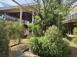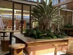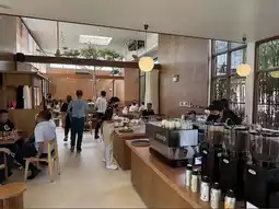 The spacious cafe is divided into indoor and outdoor areas, with glass windows providing ample natural light. The minimalist, tropical décor provides a tranquil atmosphere, perfect for relaxing or taking photos.