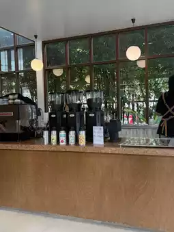 The restaurant's atmosphere is open and airy, with a green corner for relaxing. 🍃