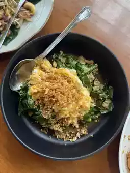 🥬 Egg and Bitter Melon Leaves – This dish is easy to eat. The eggs are fluffy and soft, sprinkled with fragrant fried garlic, perfectly contrasting the flavor of the vegetables. The Bitter Melon Leaves are not tough and delicious.