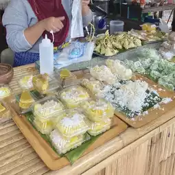 😋 The market area is filled with a variety of food vendors, including local delicacies, Southern Thai cuisine, traditional desserts, and various beverages. Environmentally friendly containers are made from natural materials, such as bamboo cylinders, coconut shells, and banana leaves. 🌿