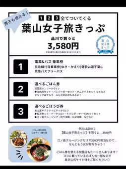 _____Hayama Girls' Trip Ticket Contents_____▶︎ [Hayama Girls' Trip Ticket Official Website] ☑️ Shinagawa ⇄ Zushi/Hayama round trip (Can also be purchased at Keikyu and other stations ◎) ☑️ Keihin Kyuko Bus Free Pass ☑️ Meal Coupon (One from the menu of participating stores) ... You can choose from a wide variety of stores and items! ▶︎ Example: Avocado Burger Set = Equivalent to 2100 yen ☑️ Reward Coupon ... You can choose from activities and souvenirs! ▶︎Example: Cut cakes from 3 shops for 1500 yen Enoshima cruise for 3300 yen ______________________ Super good value!