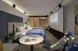 The hotel has a gym, restaurant, parking lot, lobby bar, children's play area, bar, home theater, cafe, game room, library, luggage storage, and car service.