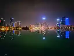 We arrived at the Fish and Water Sculpture in the northeast corner of Swan Lake before 8:00 PM. After 8:00 PM, the landmark buildings around the lake lit up and changed colors every so often for over 10 minutes. The lights came on again at 8:30 PM.
