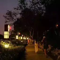 The bridges are lit with golden strips, the willow trees sway in the evening breeze, and you’ll sometimes hear a distant erhu melody or quiet laughter from families taking evening walks. Unlike noisy city streets, the park remains calm, respectful, and poetic at night — it’s more about reflection than entertainment.
