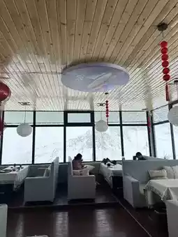 🌲❄️ A view of the snowy mountains with very cold weather. The drinks here are quite expensive. 💶 Since it's the highest point and the journey is difficult, the prices of food and drinks are around 70 yuan per person, about 350 baht. The atmosphere is great, sipping hot cocoa. ☕️ Watching the snow fall is so awesome.
