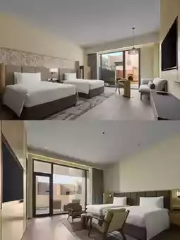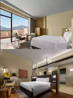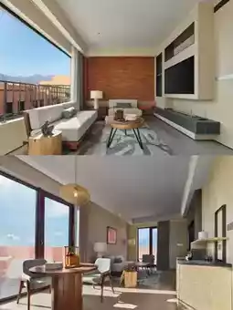 🏨The hotel is designed with a courtyard structure, integrating elements of mountains, sand, and fireplaces. The burgundy exterior wall is calm and atmospheric, and the overall atmosphere is as bold and exquisite as the word "wild luxury"🧐