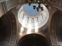 - Interior: Decorative frescoes, golden iconostasis, and candlelight create an Orthodox atmosphere.
