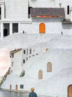 The pure white buildings are scattered in an orderly manner, just like Monument Valley. The pool in front of the ancient fort complements the fort itself, making every photo a masterpiece.