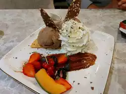The chocolate ice cream scoops were huge! Two scoops were served. The highlight was the chocolate sauce, which was rich, sweet, and fragrant with chocolate. The waffles were crispy and delicious, and they came with fresh fruit. I loved it!