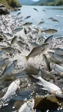 ✔️ Fish schools dense like a black tide, vigorously jumping over shallows
