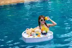 Wow! This place is truly a paradise for photography enthusiasts. You don't need to travel abroad to experience the Southeast Asian vibes of Thailand or Bali. The restaurant and rooms are surrounded by a large swimming pool, and we can swim just by stepping downstairs. The area is lush with greenery, filled with banana trees, creating a mini Southeast Asian ambiance that is absolutely stunning. Every snapshot here turns into a masterpiece! There's also a huge swimming pool and two smaller hot spring pools, with separate areas for adults and children. You can choose between low and high temperatures, so kids can enjoy the water without worrying about catching a cold. Additionally, they offer floating breakfast and afternoon tea, which are perfect for taking stylish photos—feels just like being in Sanya!