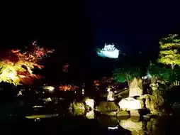 In autumn, the garden is lit up, and you can enjoy the beautiful autumn leaves and the shining white castle.
