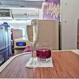 Welcome Drink is champagne and butterfly pea water. The first thing that changed was the champagne glasses, but why did I always have to use tissue paper as a coaster? The amenities for the outbound flight were from THANN, and the return flight was from another brand. The things provided were the same, nothing changed: toothbrush, comb, lip balm, etc.