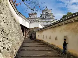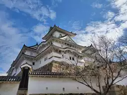 From a distance, the white walls of Himeji Castle shine charmingly under the sunlight. The entire castle is situated on a small hill, exuding a majestic aura. Upon reaching the castle gate, one can feel its imposing presence as a formidable defensive structure from Japan's Warring States period. The defensive designs on the castle walls, such as arrow slits and stone-throwing holes, perfectly showcase the sophisticated military architecture of the time.