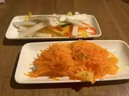 Lemon sour, carrot slaquet and pickles.
