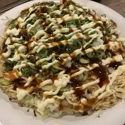 The okonomiyaki is Hiroshima-yaki, which also contains yakisoba noodles. There are also meat and seafood toppings, but personally I recommend the ones with lots of green onions!