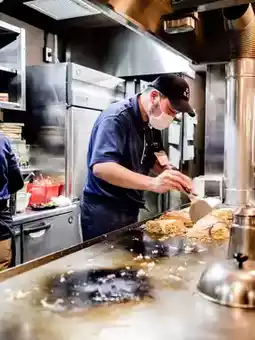 Mitchan Okonomiyaki, the most famous okonomiyaki restaurant in Hiroshima. The original branch is in Hatchobori.