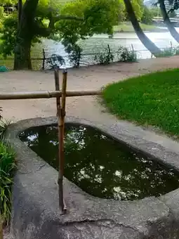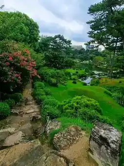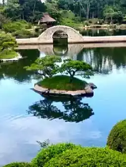 Shukkeien (縮景園) can be translated into English as "shrunken-scenery garden", which is also a good description of the garden itself. Valleys, mountains and forests are represented in miniature in the garden's landscapes. Through careful cultivation of the land and vegetation, the garden mimics a variety of natural formations and scenic views.