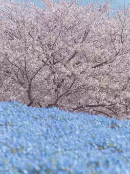 Only about a 2-hour drive from Tokyo, this park becomes a dreamy sea of blue from April to May with over 5 million Nemophila flowers carpeting the hills.