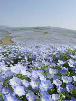 From mid-April to early May, approximately 5.3 million baby blue eyes (Nemophila) bloom, turning the entire area into a sea of vivid blue that seems to stretch into the sky.