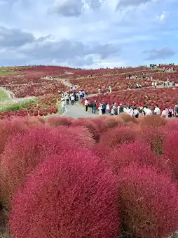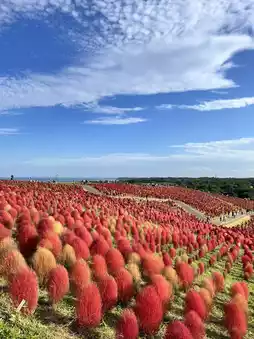 Mid-October marks the high season for the Kochia fields at Hitachi Seaside Park in Ibaraki Prefecture. This stunning natural attraction is easily accessible for a day trip from Tokyo.