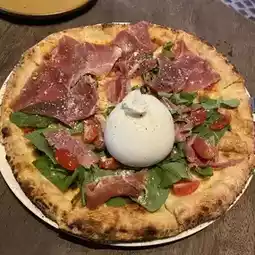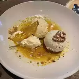 Today, we ordered a two-topping pizza. There was Parma ham and cheese, very delicious, full of cheese. And to finish, vanilla ice cream with orange sauce, just as delicious as the pizza.