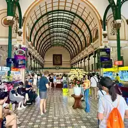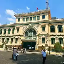 The Saigon Central Post Office is a colonial building modeled on the Musee D'orsay in France, with a striking pastel yellow exterior and a symmetrical design.