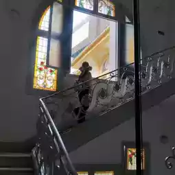 Painted glass windows, old elevators, floor tiles, shutters, undecorated wooden doors, sculptures wearing masks, spiral staircases, girls with guns