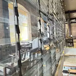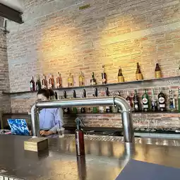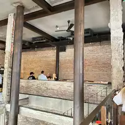 The restaurant has a nice atmosphere and is decorated with exposed concrete.