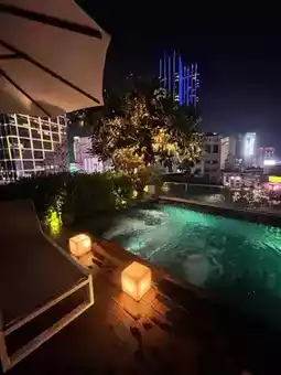 The rooftop swimming pool complements the surrounding night view and is a great place to enjoy a glass of wine and spend a leisurely evening.