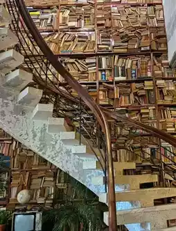 Iconic spiral staircase surrounded by a massive bookshelf