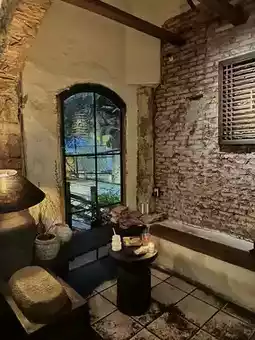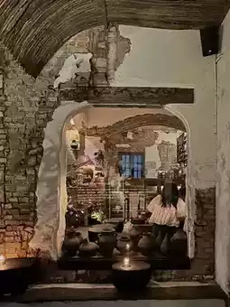 The interior features many exposed red brick designs and is adorned with numerous pottery pieces.