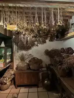 Upon entering, there's a small rose garden, and the ordering area is decorated with plenty of dried flowers.