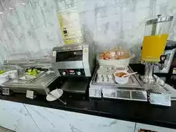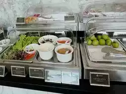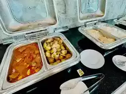 While alcohol isn't served due to the halal certification, there's a wide selection of drinks, and the food is also substantial, including chicken, fish curry, salad, fruit, and desserts.