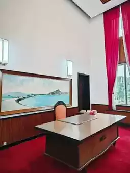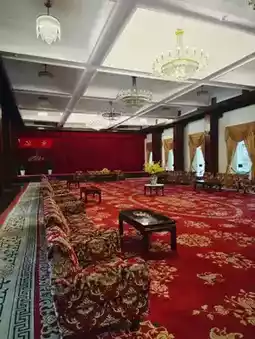 ⚪ The palace is designed in a modernist style, featuring four floors and underground levels (including a conference room, cinema, and command center).