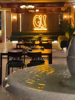 The wooden furniture and yellow lighting make it a perfect photo opportunity.