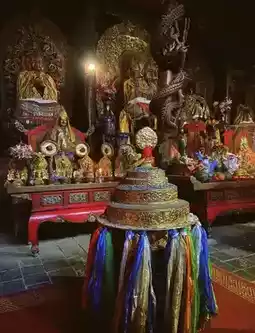 •The Bodhisattva Hall enshrines the Thousand-armed Thousand-eyed Avalokitesvara Bodhisattva. Surrounding the Bodhisattva are 21 niches enshrining 21 seated statues of Tara (the incarnation of the Bodhisattva) and dozens of prayer wheels. The standing statue of the Thousand-armed Thousand-eyed Avalokitesvara is about nine meters high and is carved from Qinghai's Pinus tabulaeformis.