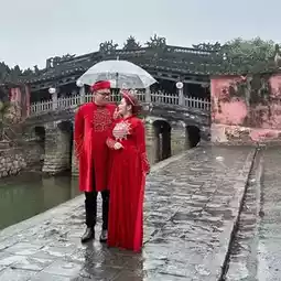 Two couples, two wedding photos, whether it is the reflection of the Hoi An River or the rainy atmosphere of the Japanese Bridge, they all bring eternal blessings to the two couples.