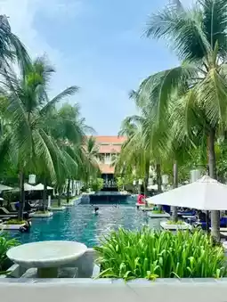 The swimming pool is surrounded by palm trees, making it even more exotic and