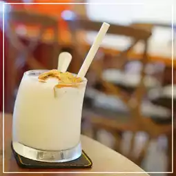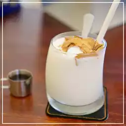Coconut chips are sprinkled on top of the white coconut smoothie,