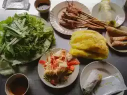 If you're visiting Hoi An, don't forget to stop by this restaurant. You don't need to think about what to eat. Just come in, order your drinks, tell them the number of people, and the food will arrive quickly... grilled pork, vegetables, sauce, and rice paper, all ready!