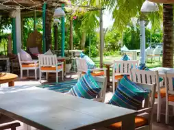A cafe where you can sit comfortably and enjoy meals and drinks while looking at the beautiful garden and the refreshing riverside view💕