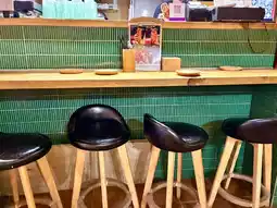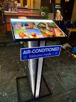 and the inside of the store is narrow but there is a bar table and air conditioning,