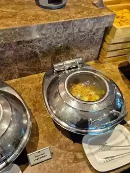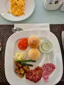 At the egg station, you can choose from omelets, scrambled eggs, or fried eggs, while Vietnamese salads and baguettes exceed expectations. Desserts like fruits and small pastries are also well-stocked.
