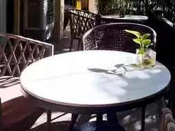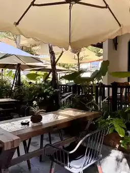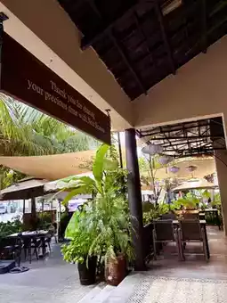 The spacious and upscale interior offers a variety of food, wine, and beverage options. The terrace and garden offer ample seating, making it a perfect place to relax.