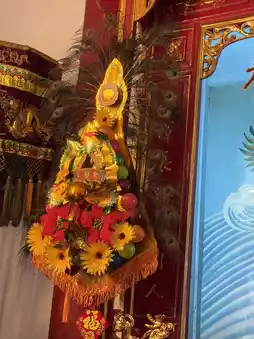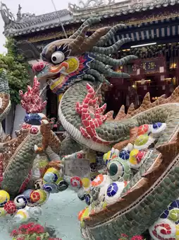 The hall is a majestic building, with vermilion gates, intricately carved eaves, and colorful porcelain dragon and phoenix decorations on the roof, showcasing the exquisite craftsmanship of Chinese artisans. Passing through the mountain gate, the courtyard is filled with the scent of incense, creating a solemn atmosphere. The main deity enshrined in the main hall is Guan Yu (Guan Gong), a symbol of loyalty, protection, and blessing, and a shared spiritual sustenance for the Chinese community.