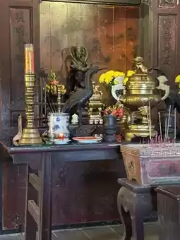 The bridge is constructed of solid wood and bluestone, with a tiled roof and intricate carvings along its sides. Inside, a porch enshrines the Bac Tai, the God of War, praying for good weather and safe journeys. Walking across the bridge, one feels the weight of history, as if every plank bears the footprints and stories of merchants and travelers.