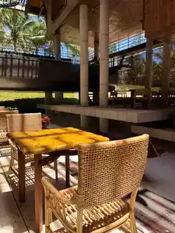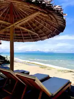 The lounge area and private beach bar are open to the public. A variety of drinks and alcoholic beverages are available, and beach umbrellas and sun loungers provide a peaceful setting for enjoying the ocean views.