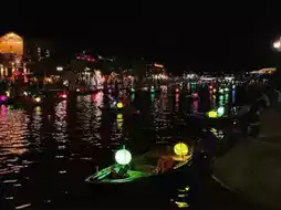 Small boats passing up and down the Thu Bon River are decorated with colorful lanterns, and the light reflected on the river's surface creates a truly magical scene.