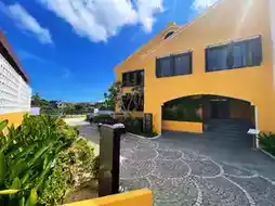 The building's yellow exterior and tropical green accents blend beautifully into the cityscape.
